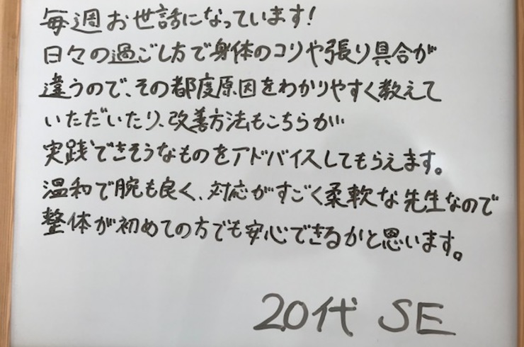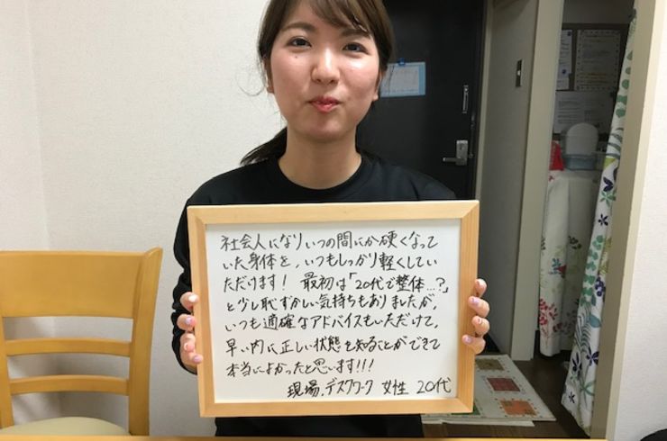 最初は「20代で整体…?」と少し恥ずかしい気持ちもありましたが、いつも適確なアドバイスも頂けて早いうちに正しい状態を知ることができて本当に良かったと思います!!!