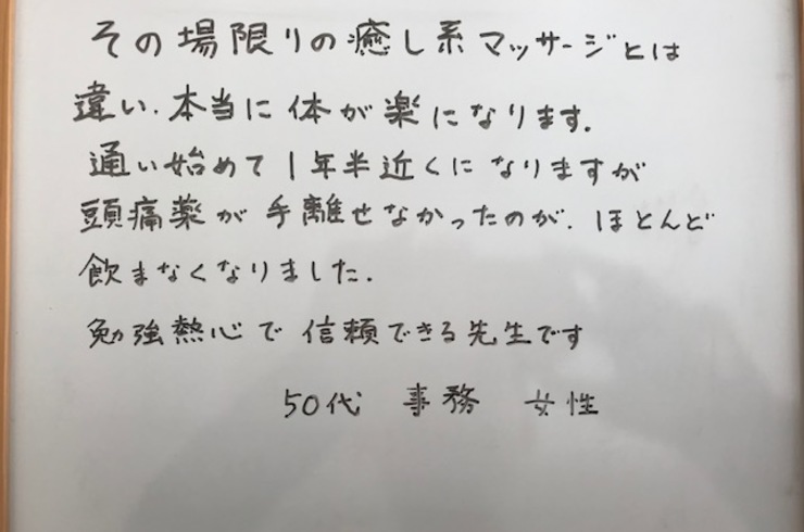 その場限りの癒し系マッサージとは違い、本当に身体が楽になります。